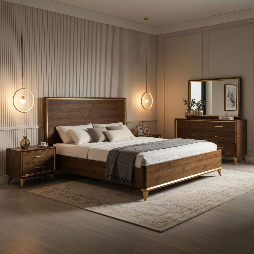 Bed frame, 2 nightstands, and dresser in dark wood with brushed gold hardware.