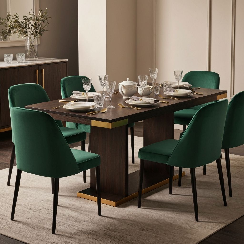6-piece modern dining table set in dark wood with brushed gold hardware.