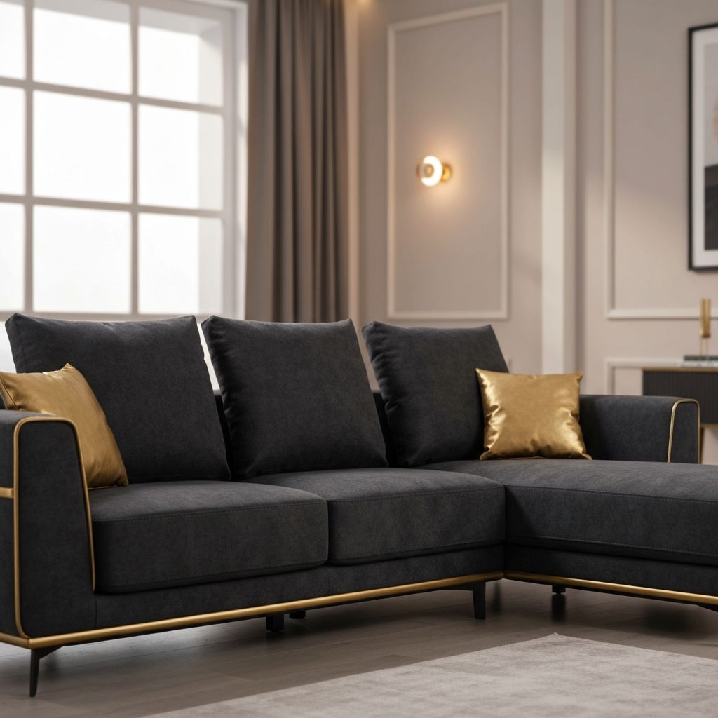 Premium charcoal fabric sectional with gold accent pillows. Denver-made quality.